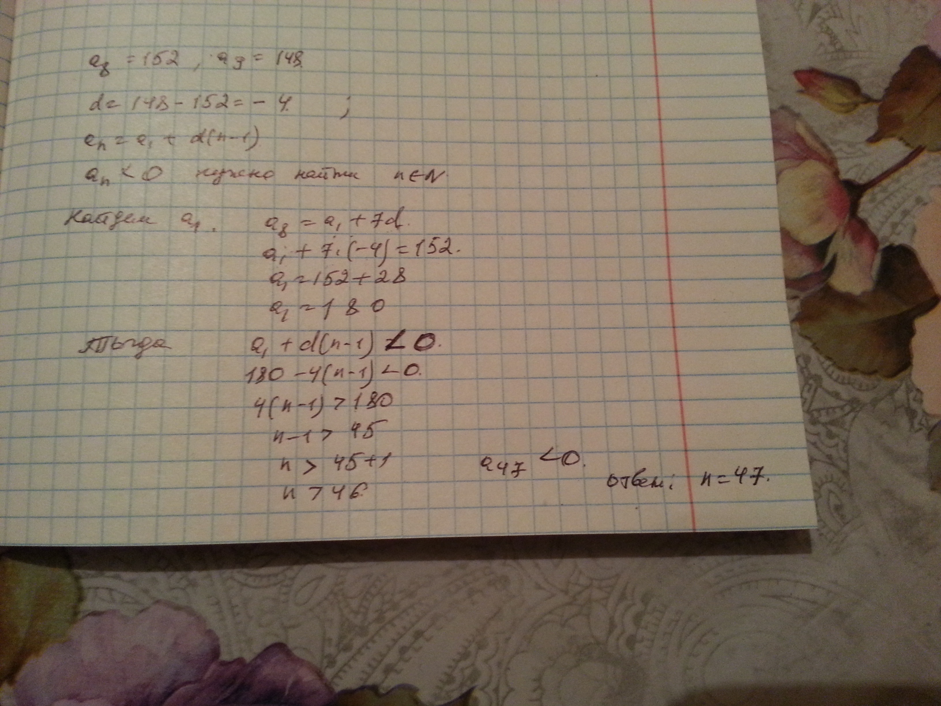 В арифметической прогрессии а8=152, а9=148 Найдите номер первого отрицательного члена этой прогрессии
