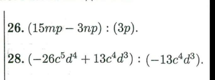 (15mp-3np):(3p)=15mp:3p-3np:3p=5m-n \ (-26c^5d^4+13c^4d^3):(-13c^4d^3)=26c^5d^4:13c^4d^3-13c^4d^3:13c^4d^3= \ =2c^{5-4}d^{4-3}-1*c^{4-4}d^{3-3}=2cd-1