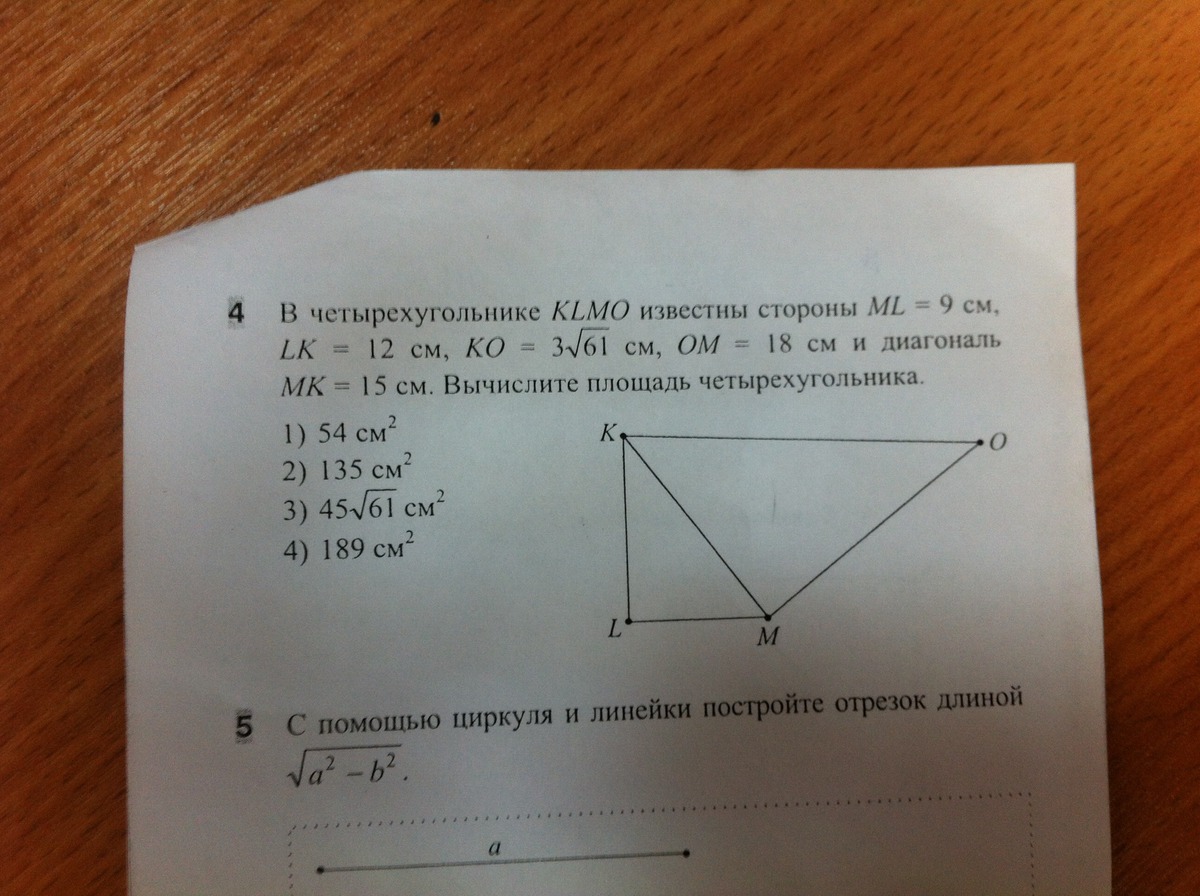 S(четырехугольника KLMO)=S(Δ KML)+S(Δ KM0)=54+135=189 кв. ед