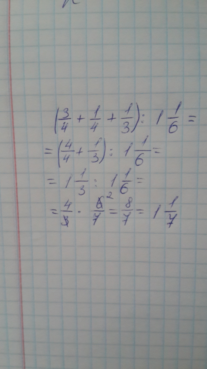 (3/4+1/4+1/3) : 7/6 = 4/3 : 7/6 = 4/3 * 6/7 = 8/7 = 1 1/7