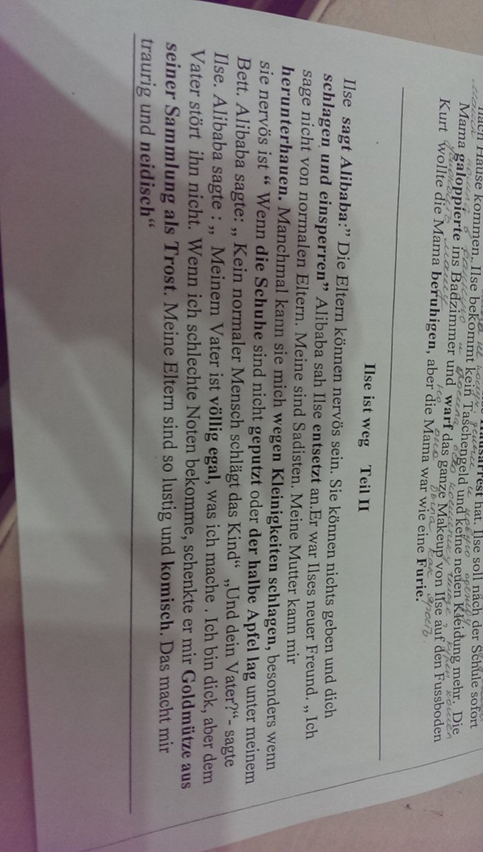 Ильзе говорит Алибабе:"Родители могут быть нервными. Они могут ничего не давать,бить и запирать тебя. Алибаба в ужасе оглядел Ильзу. Он был её новым другом."Я не говорю о нормальных родителях. Мои -- садисты. Моя мама может бить меня. Иногда за малейшие провинности,особенно когда нервничает,например если обувь не почищена или половинка яблока лежит под кроватью.