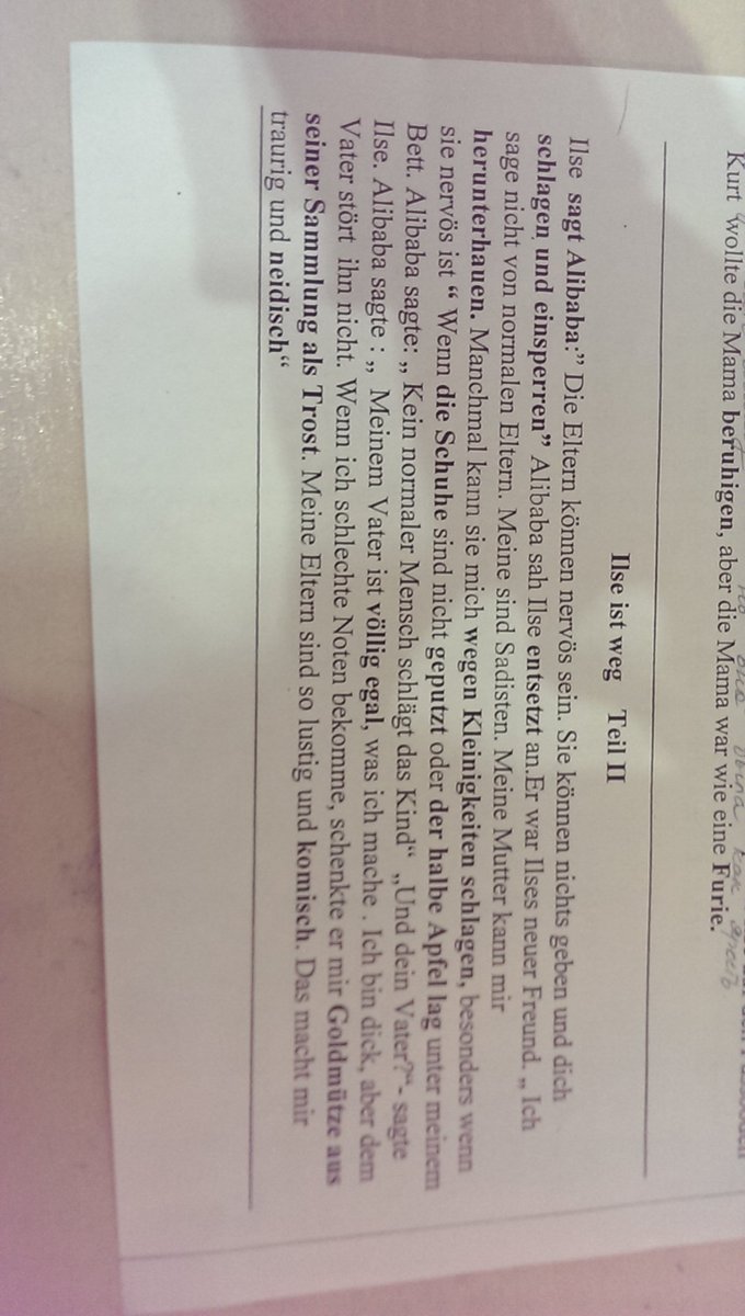 Ильза сказала Алибабе:"Родители могут быть раздражительными. Они могут ничего не давать,бить и запирать тебя." Алибаба в ужасе посмотрел на Ильзу. Он был её новым другом."Я ничего не скажу о нормальных родителях. Но мои -- садисты. Моя мать может меня ударить. Иногда она может бить за пустяки,особенно когда нервничает "Когда туфли не почищены или половинка яблока лежит под моей кроватью. Алибаба сказал:"Ни один нормальный человек не ударит ребёнка. " "А твой отец?" -- сказала Ильзе. Алибаба сказал:"Моему отцу абсолютно безразлично,что я делаю. Я толстый,но отца это не беспокоит. Когда я получаю плохие оценки,в утешение он дарит мне золотые пфеннинги из своей коллекции. Мои родители весёлые и комичные. Это заставляет меня грустить и завидовать."