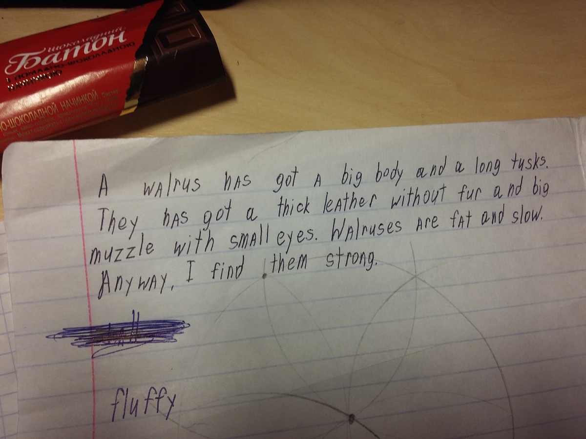 У моржа большое тело и длинные клыки. У них большая кожа без меха и большая мордочка с маленькими глазами. Моржи толстые и медленные. Во всяком случае, я считаю их сильными.