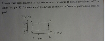 1 моль газа переводится из состояния А в состояние В двумя способами : АСВ АDВ. В каком из этих случаев совершается большая работа,и во сколько раз?