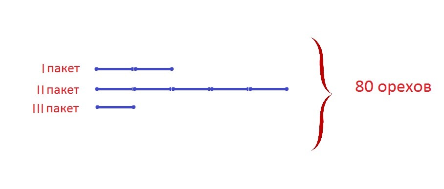 орехи надо разложить в три пакета так, чтобы в одном пакете оказалось орехов в два с половиной раза меньше, чем в другом, но в два раза больше, чем в третьем. Сколько орехов надо положить в каждый пакет если всего имеется 80 орехов. решить не уравнением.