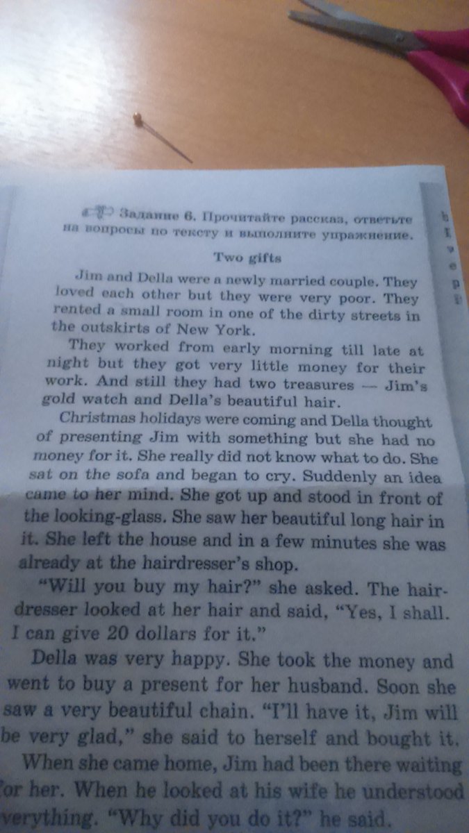 Две девушки Джим и Делла были молодожены Они пара. любили друг друга, но они были очень бедными Они я. снимаю небольшая комната в одном из грязных улиц на окраине Нью-Йорка. Они работали с раннего утра до поздней ночи, но они получили очень мало денег за свою работу. А еще у них было два сокровища Джим золотые часы и красивые волосы Деллы. Рождественский праздник приходили и Делла думал представления Джим с чем-то, но она не имела никаких денег за это, она действительно не знаю, что делать. Вhe сел на sofn и начал плакать. Вдруг идея. Камо ее ум. Она встала и стояла перед зеркалом. Она увидела ее красивые длинные волосы в нем. Она покинула дом, и через несколько минут она уже была в парикмахерской. "Будете ли вы покупать мои волосы?" она спросила. Волосы. комод посмотрел на ее волосы и сказал, "Да, я. Я могу дать 20 долларов за него." Делла был очень счастлив. Она взяла деньги и пошел, чтобы купить подарок для своего мужа. Вскоре она увидела очень красивую цепочку. "Я буду иметь это, Джим будет очень рад." она сказала себе, и купил ее. Когда она пришла домой, Джим был там ждет или ее. Когда он посмотрел на жену, он понял, verything. "Зачем ты это сделал?' он сказал, ЗАКРИТИ