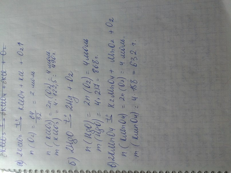Пожалуйста напишите подробно и формулы. Задание: Определите массу каждого вещества, которое следует подвергнуть разложению, чтобы получить 64 г. О2 а) KCLO3 б)HgO в)KMnO4. Пожалуйста решите в подробностях!