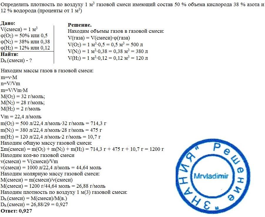 Определить плотность по воздуху 1 м^3 газовой смеси имеющий состав 50 % объема кислорода 38 % азота и 12 % кислорода(проценты от 1 м^3)