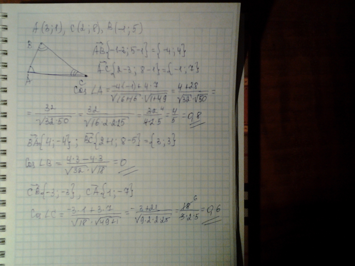 Применены формулы координат вектора и угла между векторами через их координаты. А треугольник оказался прямоугольным: угол В = 90 градусов, т.к. его косинус равен 0.