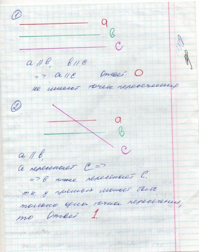 Даны три прямые а, b, с; а ІІ b, b ІІ с. Сколько общих точек имеют прямые а и с? хотя бы это или