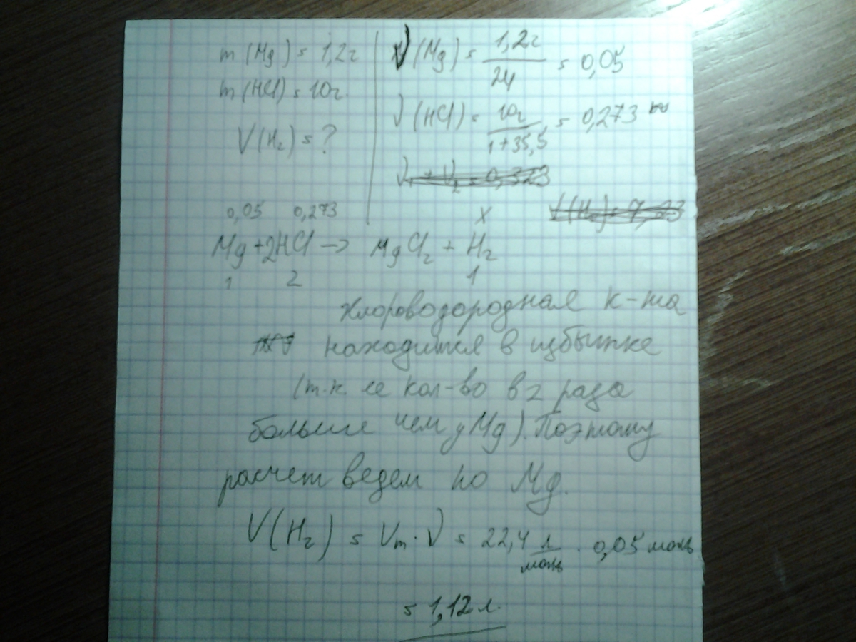 вычислите объем водорода (н.у.) , который может выделиться при взаимодействии 1.2 г магния с 10 г хлороводородной кислоты