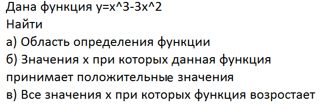 а) область определения - это множество допустимых значений аргумента (х). Что значит "допустимые значения аргумента"?Если есть допустимые, значит, есть и недопустимые?Любая функция предполагает, что выполняются какие-то действия с аргументом (х) И есть значения аргумента, когда действия не выполняются ( делить на 0 нельзя, нельзя извлечь корень из отрицательного числа и т.д.) В нашем случае у = x^3 - 3x^2 . все действия выполняются при любом х . Ответ: х - любое