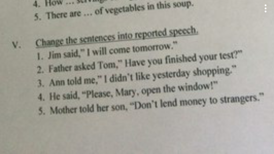 Jim told that he would come the next day.Father asked Tom if he had finished his test.Ann told that se hadn't liked shopping the day before. He told not to open the window.Mother told her son not to lend money to stranges.