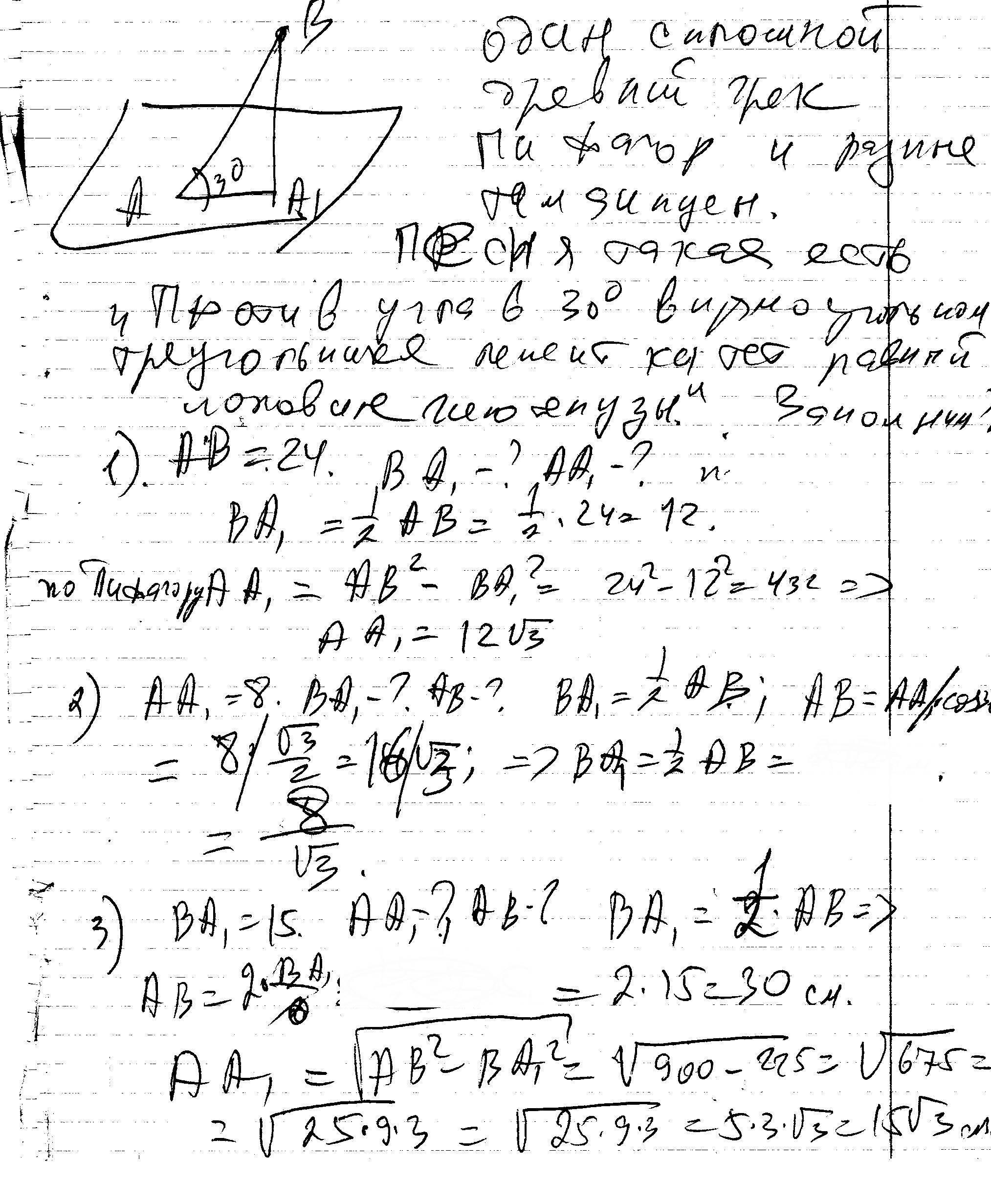 Прямая АВ пересекает плоскость альфа под углом 30 градусов.АА1-перпендикуляр,а ВА1-проекция АВ на плоскость альфа.Найдите: 1)ВА1 и АА1 , если АВ = 24 см,2) Длину проекции ВА1 наклонной АВ, если АА1= 8 см,3)Длину наклонной АВ и длину перпендикуляра АА1, если ВА1= 15 см