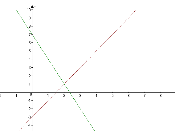 Построим график функции y = 7 - 3x (выразили переменную у из системы уравнения (1)), графиком этой функции является прямая, которая проходит через точки (0;7), (7/3; 0)