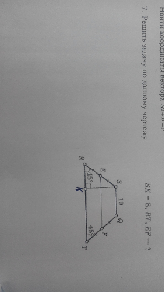 Дана трапеция RSQT, угол T = углу R = 45, SQ = 10, SK = 8, EF средняя линия. Найти EF, RT. Решите подробно пожалуйста)