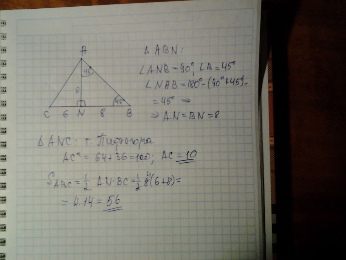 В треугольнике ABC угол B=45 градусов, высота AN делит сторону BC на отрезки BN=8 см и NC=6 см. Найдите площадь треугольника ABC и сторону AC.