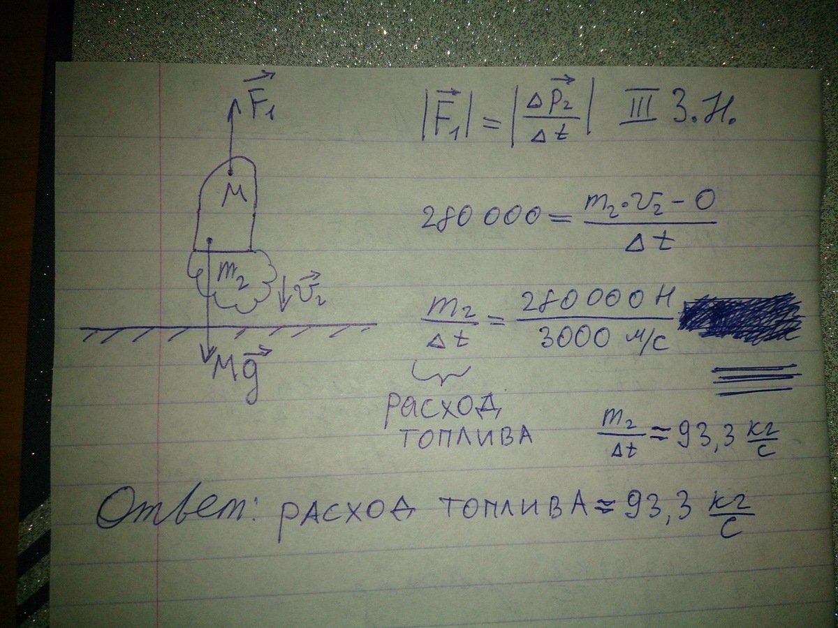 Сила тяги самолета составляет 280 кН, а его масса равна 25 т. Если самолет двигается вертикально вверх, и скорость истечения газов составляет 3000 м/с, то каков расход топлива (в кг/с) при таком движении?