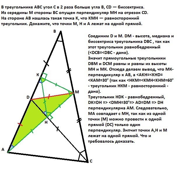 В треугольнике ABC угол C в 2 раза больше угла B, CD — биссектриса. Из середины M стороны BC опущен перпендикуляр MH на отрезок CD. На стороне AB нашлась такая точка K, что KMH — равносторонний треугольник. Докажите, что точки M, H и A лежат на одной прямой.