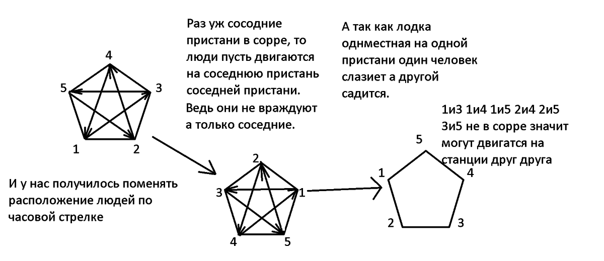 На берегах озера по кругу стоит 5 пристаней, на каждой человек, у одного из них одноместная лодка. Люди с соседних пристаней в ссоре, и встречаться друг с другом не хотят. Как каждому из них перебраться на соседнюю по часовой стрелке пристань, если передвигаться можно только по озеру?
