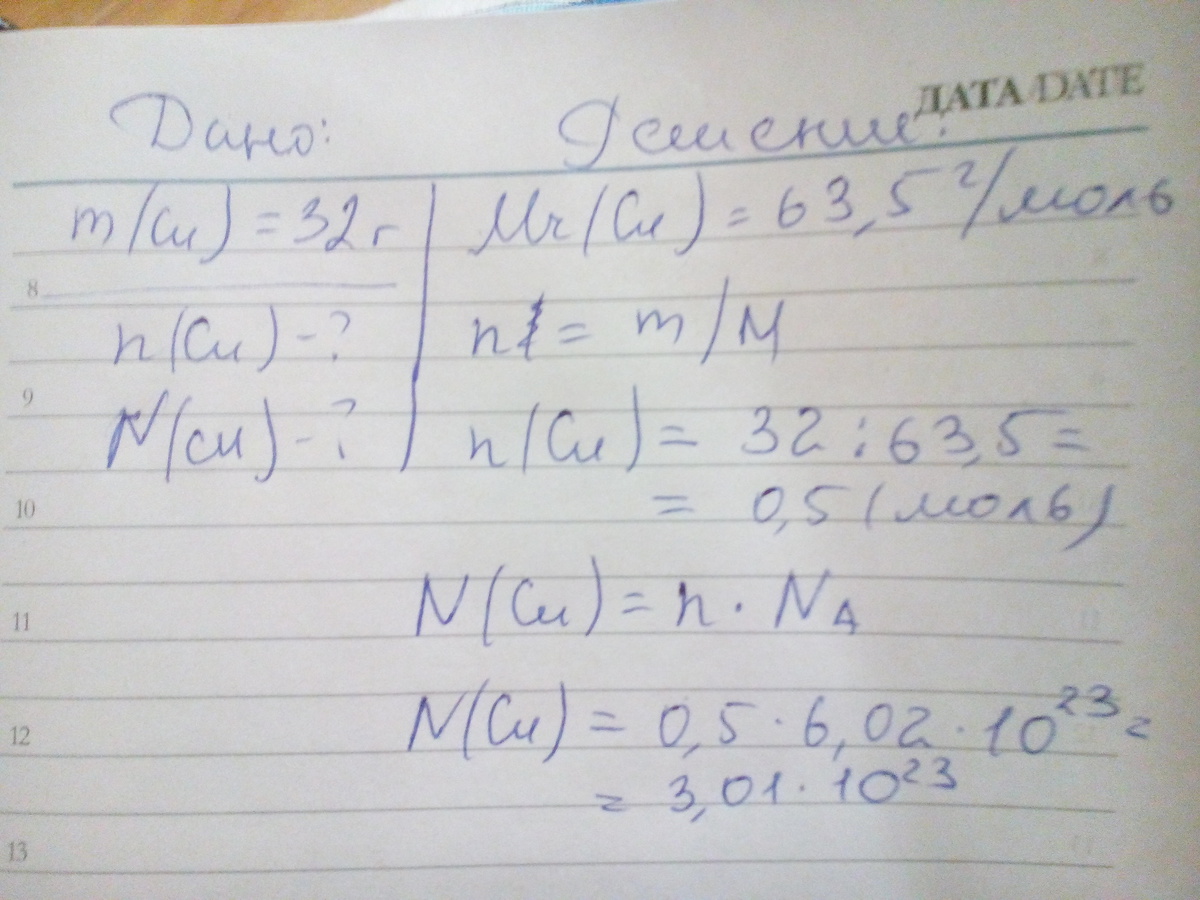 рассчитайте колличество вещества в медной проволке массой 32г.найти число молекул в этом количестве.