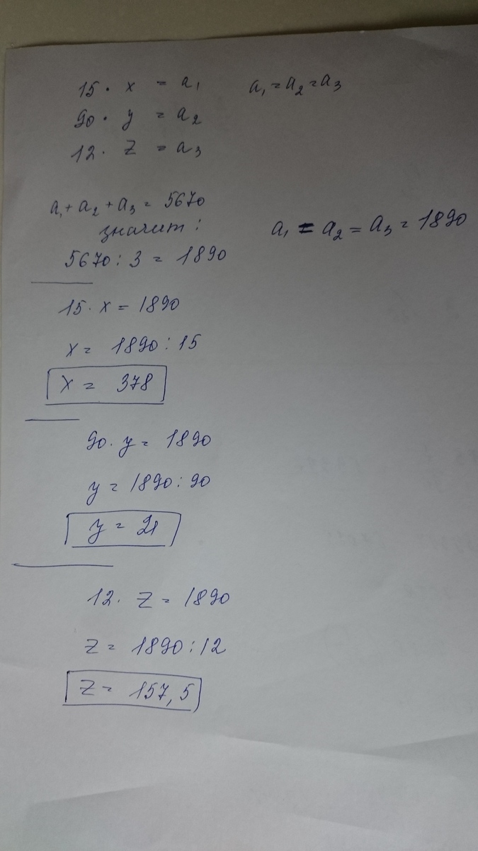 Найди,на какие числа нужно умножить числа 15,90,и12,чтобы получить три равных между собой произведения,если сумма всех трех этих произведений равна 5670