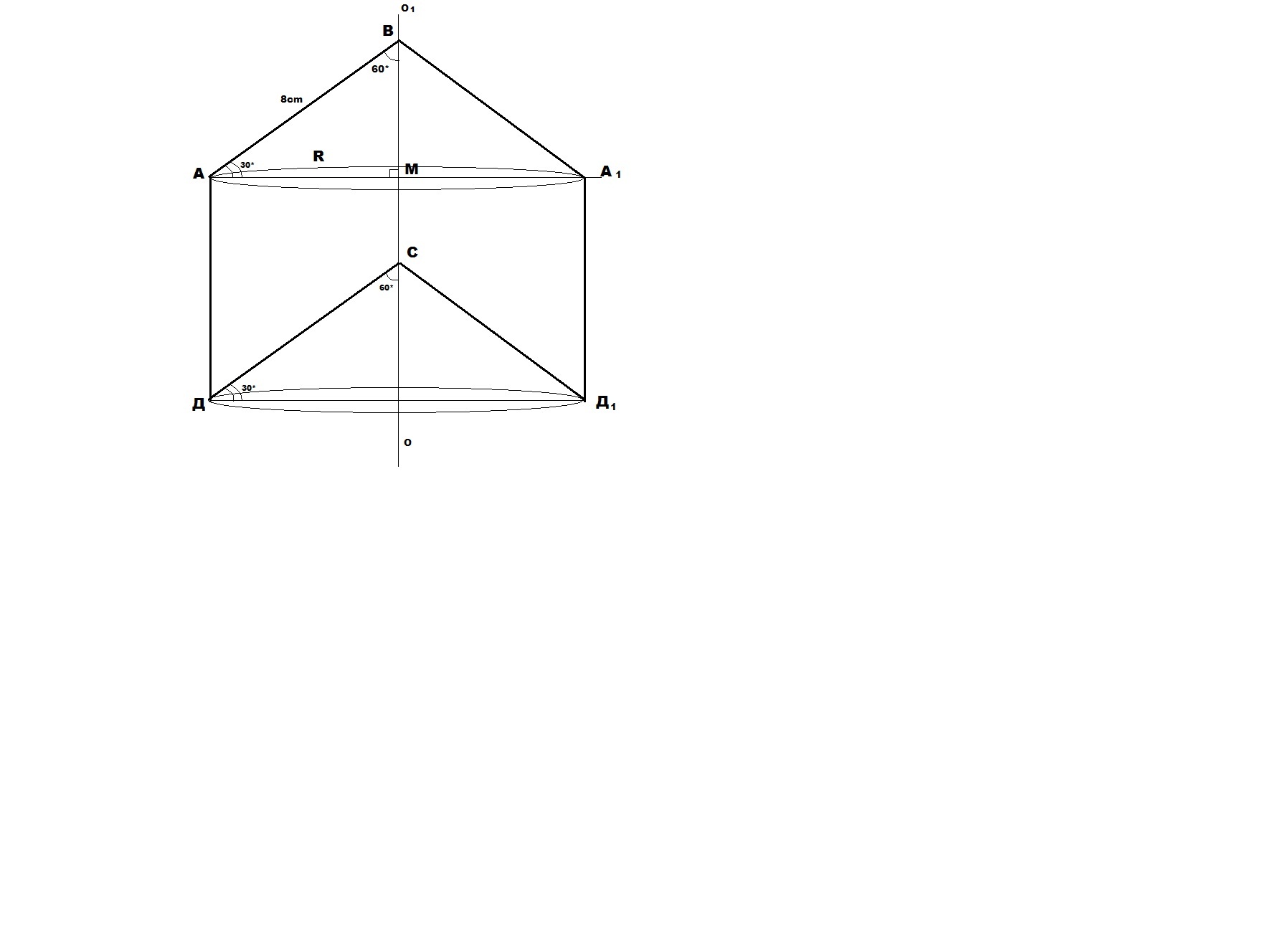 рассмотрим конусы 1- с вершиной О1 иоснованием АА1, 2- с вершинойС и основаниемДД1 . 1=2 т.к. равны углы при вершине , равны образующиеАВ=СД, значит V тела вращения вычисляем по Vцилиндра =Sосн*Н
