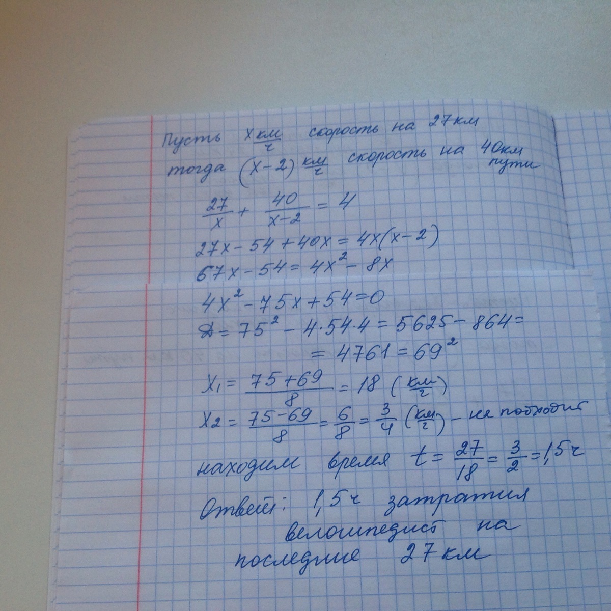 Велосипедист проехал расстояние 67 км за 4 часа, причём на последних 27 км пути его скорость была на 2 км/ч больше, чем на предыдущем участке пути. Сколько времени затратил велосипедист на последние 27 км пути? Ответ дайте в часах.