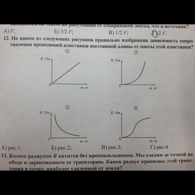 На каком из следующих рисунков правильно изображена зависимость сопротивления проводящей пластинки постоянной длинны от массы этой пластинки