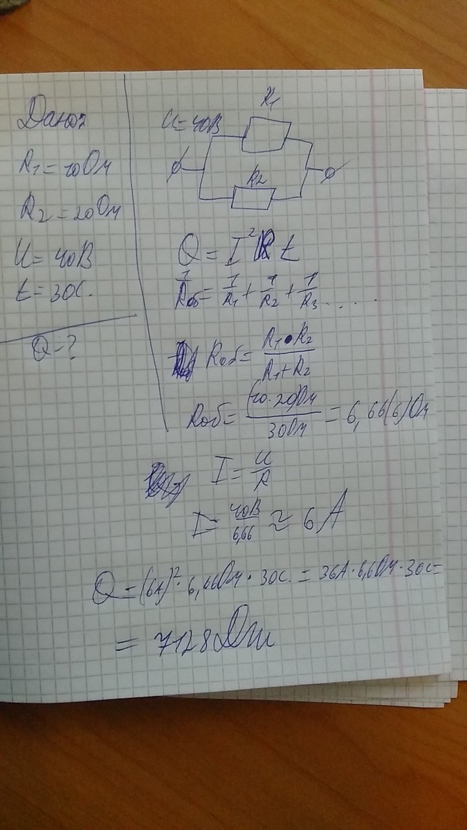 Два резистора сопротивлениями 10 Ом и 20 Ом соединены параллельно и подключены к источнику тока,напряжение на зажимах которого 40 В.Какое количество теплоты выделится в обоих резисторах за 30 с?