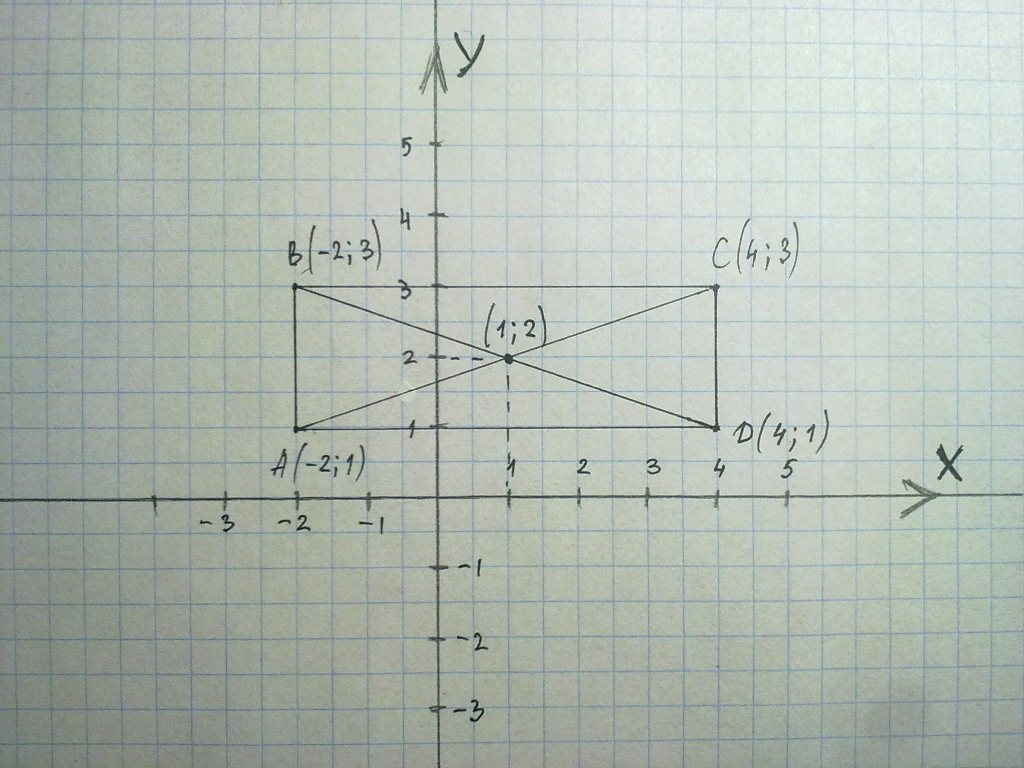 У прямоугольника ABCD вершины A(-2;1),B(-2;3),C(4;3).Постройте прямоугольник и найдите координаты точки пересечения его диагоналей.