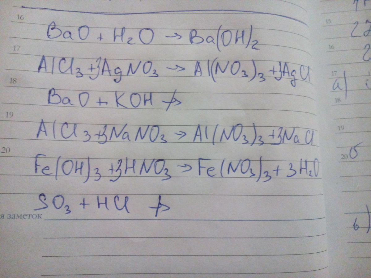 Допишите уравнения на химических реакциях, которые практически возможны: BaO+H2O= AlCl3+AgNO3= BaO+KOH= AlCl3+NaNO3= Fe(OH)3 + HNO3= SO3 + HCl