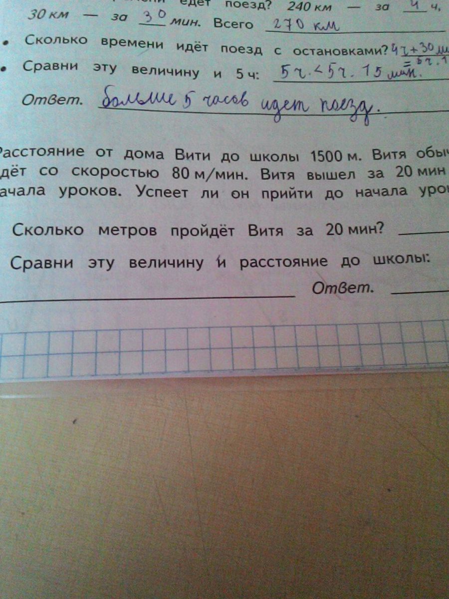номер 3. расстояние от дома Вити до школы 1500м .Витя обычно идёт со скоростью 80 м в мин. Витя вышел за 20 мин до начала уроков. Успеет ли он прийти до начала уроков?