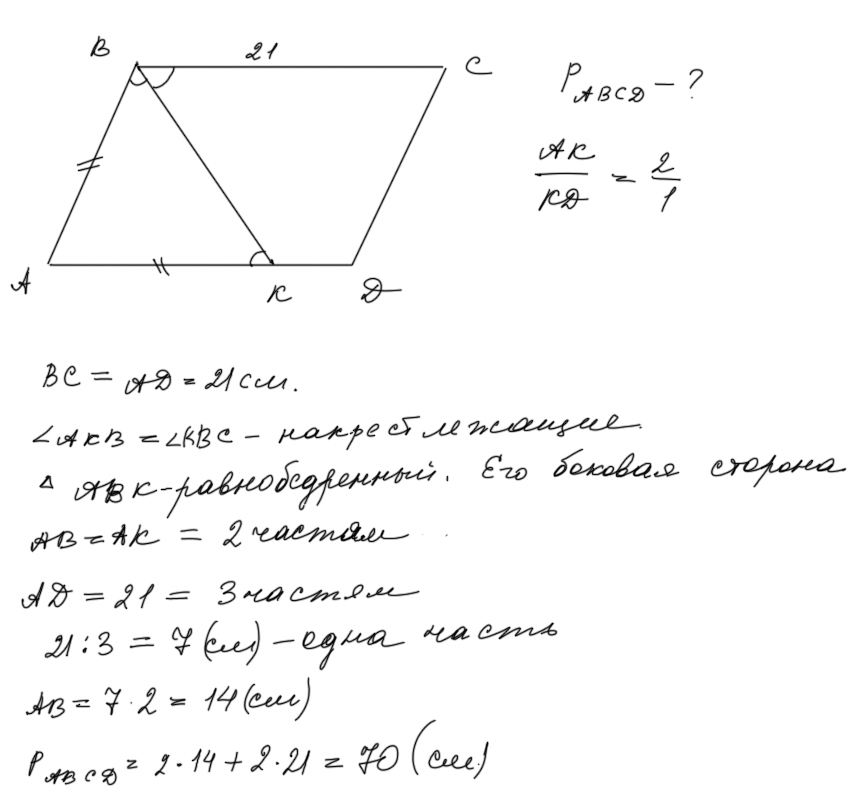 в параллелограмме ABCD из вершины тупого угла B проведена биccектриса BK. Найдите периметр параллелограмма, если АК:KD=2:1, a BC=21