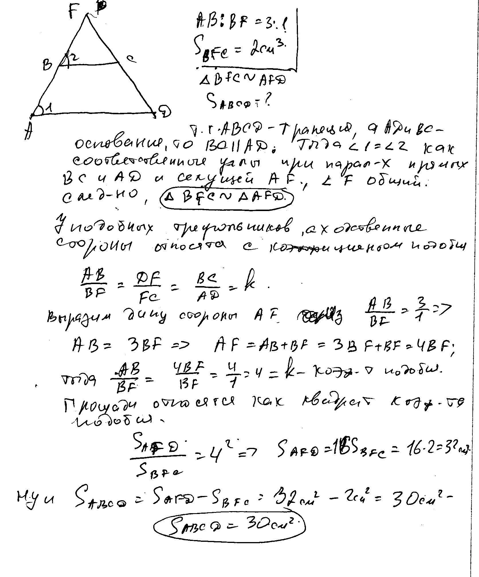 В трапеции ABCD продолжение боковых строн AB и CD пересекаются в точке F . Докажите , что треугольник BFC и AFD подобнее . Найдите площадь трапеции ABCD ,