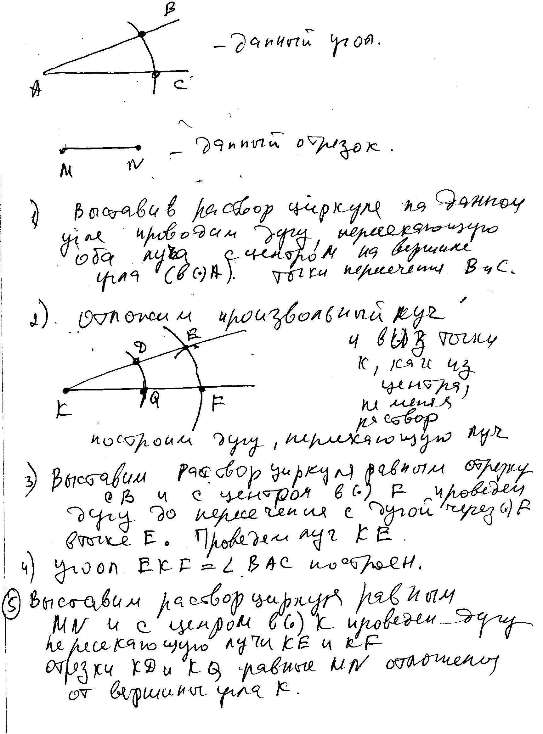 постройте угол равный данному углу и на его сторонах от вершины угла отложите отрезки равные данному отрезку