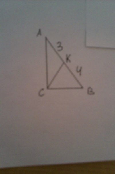 Помогите с задачей ! Условия: abc- прямоугольный треугольник, ck- биссектриса, ak=3, kb=4. Найти площадь треугольника abc. см. рис.