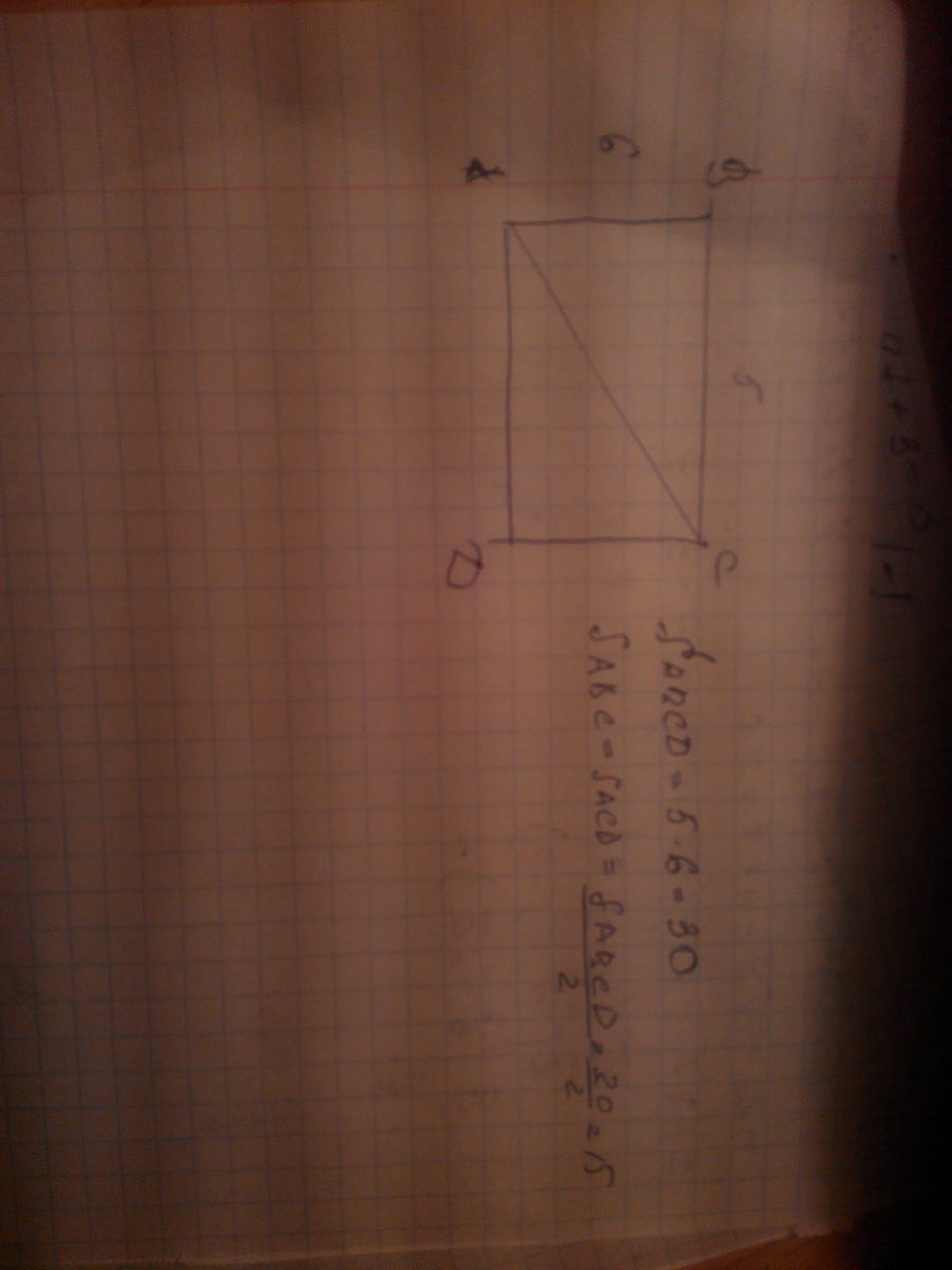 Начертите прямоугольник АВСД, соедините отрезком вершины А и С.Найдите площади треугольника АВС и АСД, если АВ=6см и ВС=5 см.