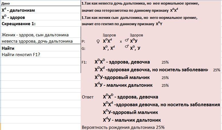 Дочь дальтоника выходит замуж за сына другого дальтоника, причём жених и невеста различают цвета нормально. Каким будет зрение у их детей?