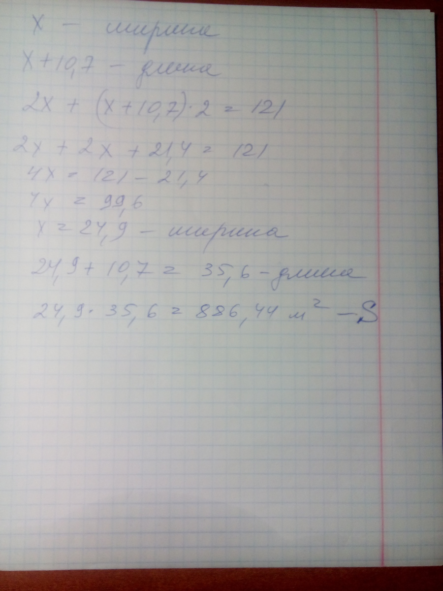 Прямоугольная часть внутреннего помещения Успенского собора имеет периметр 121 м , при этом длина его на 10,7 м больше его ширины. Вычислите с точностью до 1 кв.м площадь прямоугольной части внутреннего помещения собора.