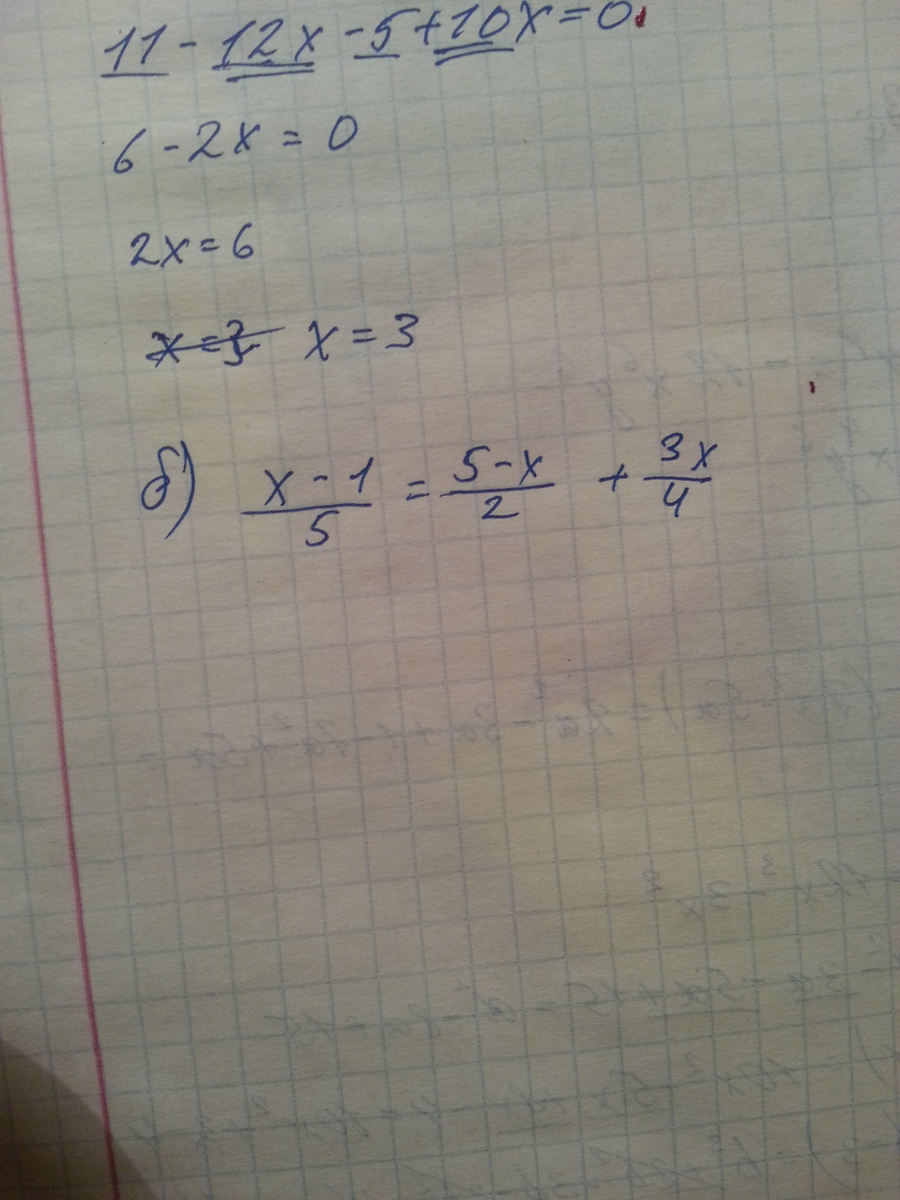 Умножаешь каждое слагаемое на 20, в итоге знаменатель у тебя сокращается и выходит -11х-4-(50-10х)=0