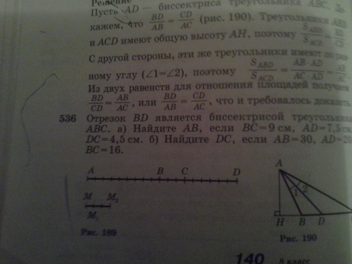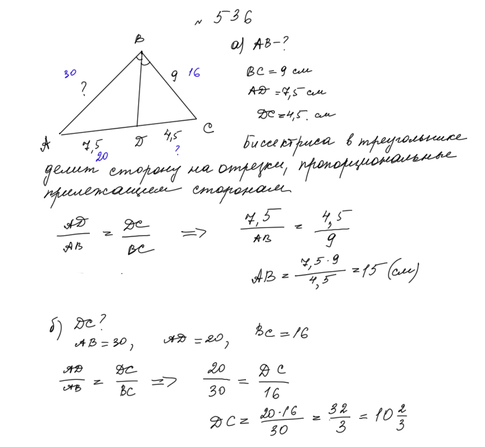 Биссектриса поделила сторону треугольника на два отрезка. Отношения получившихся отрезков к прилежащим сторонам равны. И равенства этих отношений мы и находим нужную нам сторону, т. е. составляем пропорцию и находим одно неизвестное.