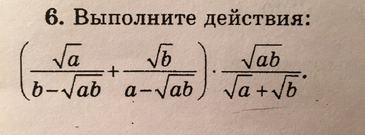 ( frac{ sqrt{a} }{b- sqrt{ab} } + frac{ sqrt{b} }{a- sqrt{ab} } )* frac{ sqrt{ab} }{ sqrt{a}+ sqrt{b}  } =( frac{ sqrt{a} }{ sqrt{b}( sqrt{b}  - sqrt{a}) } + frac{ sqrt{b} }{ sqrt{a}( sqrt{a}  - sqrt{b} )} )* frac{ sqrt{ab} }{ sqrt{a}+ sqrt{b}  } =( frac{ sqrt{a} }{ sqrt{b}( sqrt{b}  - sqrt{a}) } - frac{ sqrt{b} }{ sqrt{a}( sqrt{b}  - sqrt{a} )} )* frac{ sqrt{ab} }{ sqrt{a}+ sqrt{b}  } =frac{ (sqrt{a})^2-( sqrt{b})^2  }{ sqrt{ab} ( sqrt{b}- sqrt{a} ) }* frac{ sqrt{ab} }{ sqrt{a}+ sqrt{b}  } = frac{( sqrt{a}- sqrt{b})( sqrt{a}+ sqrt{b}) }{-( sqrt{a}- sqrt{b})( sqrt{a} + sqrt{b} )} =-1