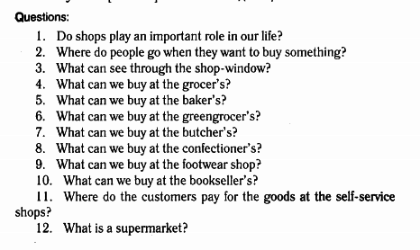 At the grocer’s you can buy sugar, tea, coffee, salt, pepper, ham, bacon, sausages, frankfurters and so on. Bread is sold at the baker’s, meat at the butcher’s. We go to the greengrocer’s for vegetables and fruit. Cakes and sweets are sold at the confectioner’s. When we want to buy clothes, we go to men’s and ladies clothes shop. We buy boots and shoes at the footwear shop. We buy jewelry at the jeweler’s. We buy books at the bookseller’s.