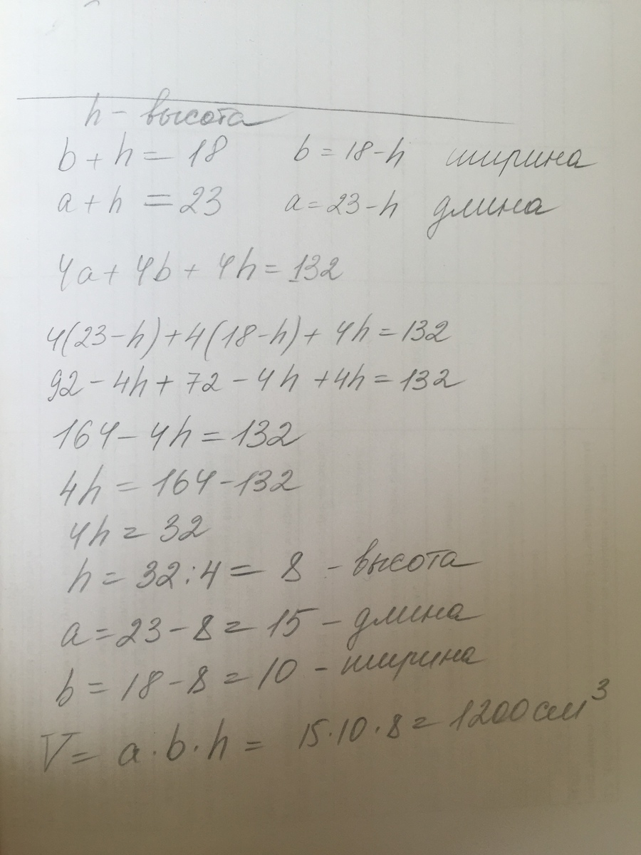 Найдите объём прямоугольного параллелепипеда, если сумма его ширины и высоты равна 18 см , сумма длины и высоты- 23 см, а сумма длин всех рёбер - 132 см.