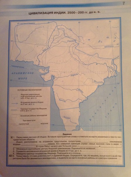 ...на острове Индостан,омываемом водами Индийского океана,Аравийским морем и Бенгальским заливом. Реки-Ганг и Инд. Попробуй обозначить сама,т.к. я не знаю как объяснить) Удачи!