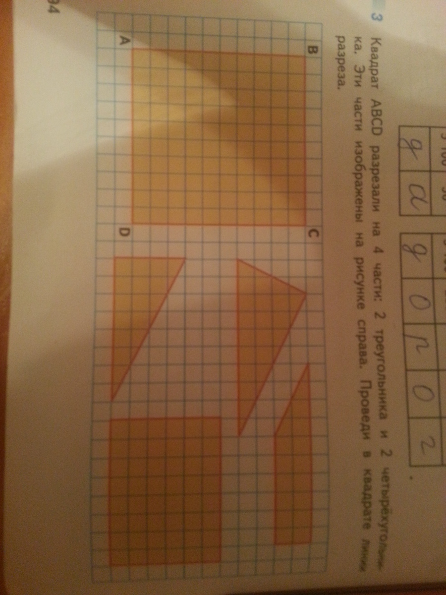 Квадрат ABCD разрезали на 4 части: 2 треугольника и 2 четырёхугольника. Эти части изображены на рисунке справа. Проведи в квадрате линии разреза.