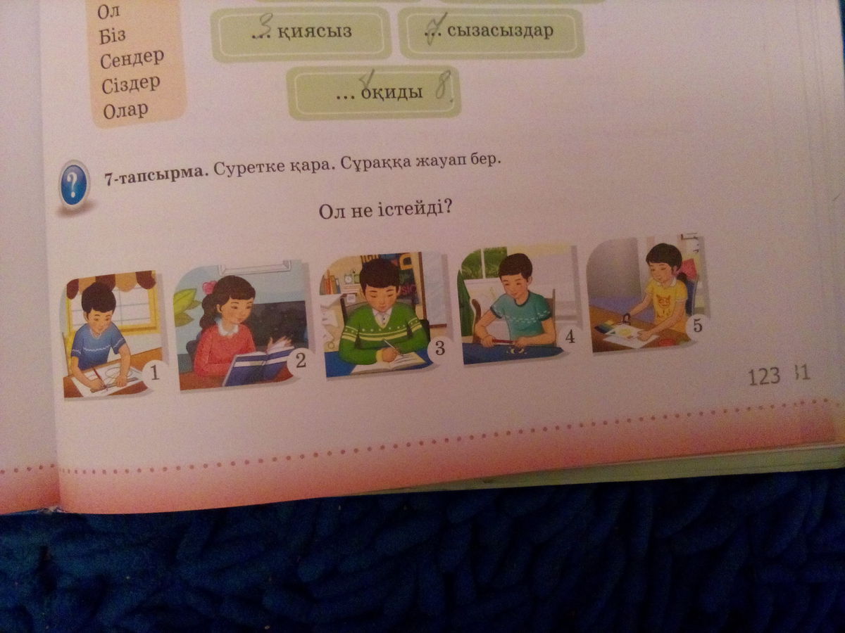 1.Бала сүрет салып отыр.2.Қыз кітап оқып отыр.3.Бала дəптерге жазып отыр.4.Бала қарындаш тазалап отыр.5.Қыз қағаз қыйып отыр.