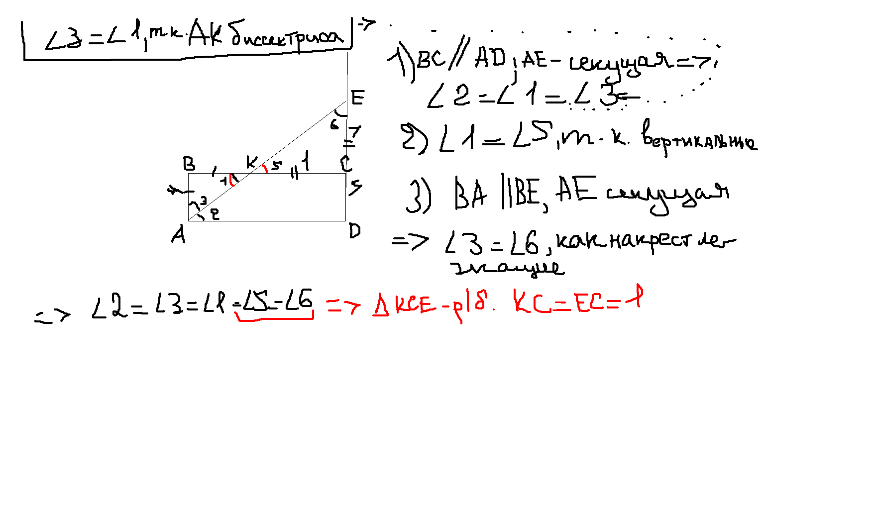 помогите пожалуйста умираю!!! В параллелограмме ABCD длина отрезка AB равна 4. Биссектриса угла А пересекает сторону ВС в точке К, а продолжение стороны CD в точке Е. Найдите длину отрезка КС, если ЕС =1