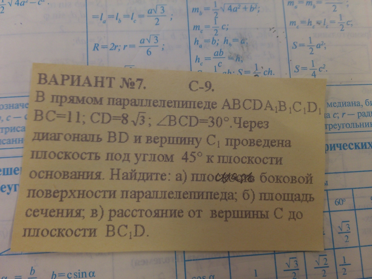 Аналогично, из ΔВСС1: ВС^2=BC^2+CC1^2=121+577|4=265,25......Затем примени формулу Герона.